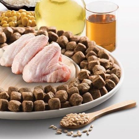 乾燥鶏肉タンパク質、小麦粉、バルドライス、トウモロコシ、精製チキンオイル、アンチョビミール、ビール乾燥酵母、アンチョビオイル、イナゴマメ、ヌクレオチド酵母タンパク質、乾燥ビートパルプ、ミネラル類(銅,亜鉛.マンガン,セレン)、プレバイオティクスマンナンオリゴ糖、アミノ酸類(グルコサミン)、ムコ多糖(コンドロイチン)、ビタミン類(A,C,E,D3,ナイアシン) |